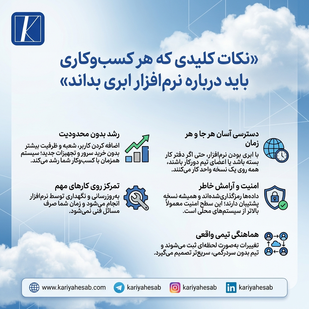 استفاده از سیستم ابری یعنی تمرکز روی رشد کسب و کار و تصمیم گیری هوشمندانه ، نه صرفاً مدیریت فایلها و سرورها. وقتی تیم شما همزمان روی یک پروژه کار میکند و اطلاعات لحظهای به روز رسانی میشود ، سرعت تصمیم گیری و بهرهوری به شکل چشمگیری افزایش پیدا میکند.